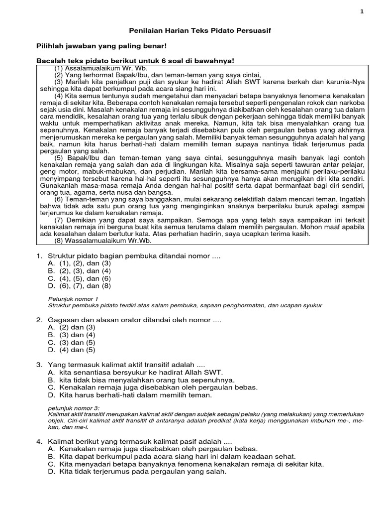 Bahasa Indonesia Pada kesempatan kali ini admin akan membagikan contoh soal teks pidato persuasif dalam mata pelajaran bahasa Indonesia dilengkapi dengan kunci jawaban terbaru kurikulum 2013. Demikianlah yang dapat kami jelaskan tentang ciri kebahasaan teks pidato persuasif di kelas 9 mata pelajaran bahasa Indonesia.
