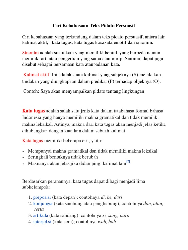 Kata tugas ialah sejenis kategori kata dalam tata bahasa Indonesia dan terdiri atas kata depan kata sambung kata sandang dan kata seru. Pada bagian sebelumnya sudah dijelaskan bahwa teks pidato persuasif memiliki kaidah-kaidah kebahasaan yang menandai teks seperti. 9th - Professional development.