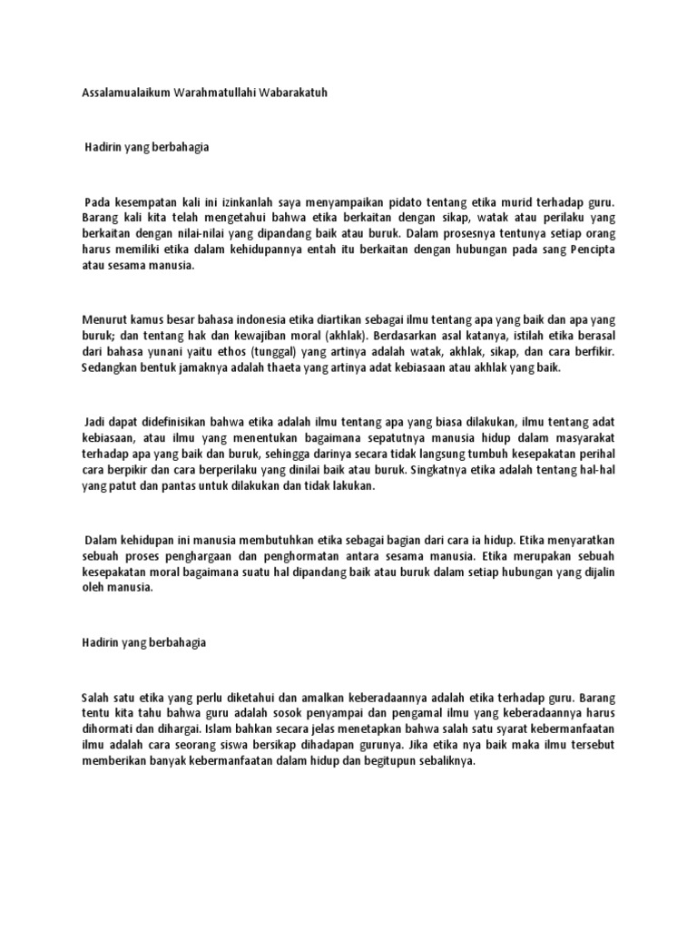 Pada kesempatan kali ini kami ingin berbagi informasi dan referensi teks pidato islami ada yang singkat keren dan tentunya terbaik. Di era globalisasi ini banyak remaja yang terjerumus kedalam pergaulan bebas. Examples translated by humans.