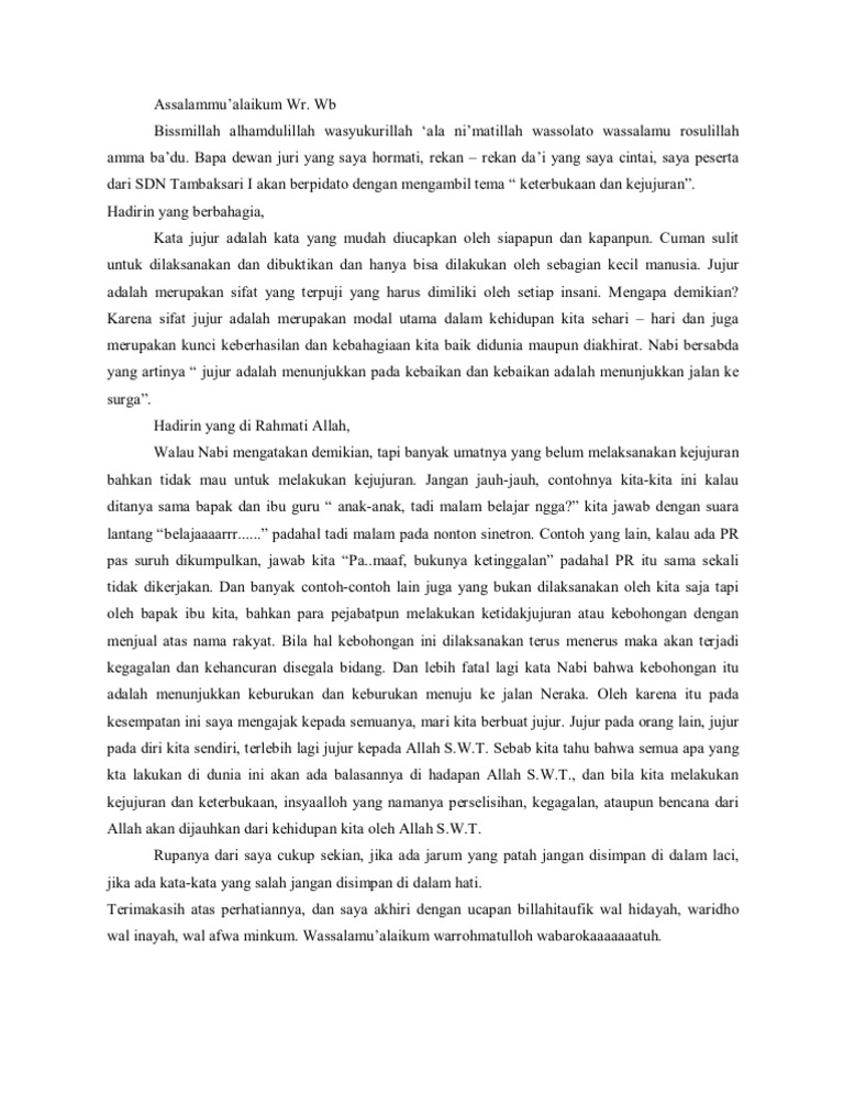 Contoh teks ceramah tentang. Pembukaan Teks Pidato Agama Islam Tentang Kejujuran Assalamualaikum WrWb. Di pagi hari ini saya memohon izin kepada para hadirin disini untuk menyampaikan suatu pidato singkat mengenai kejujuran sebagai temanya.