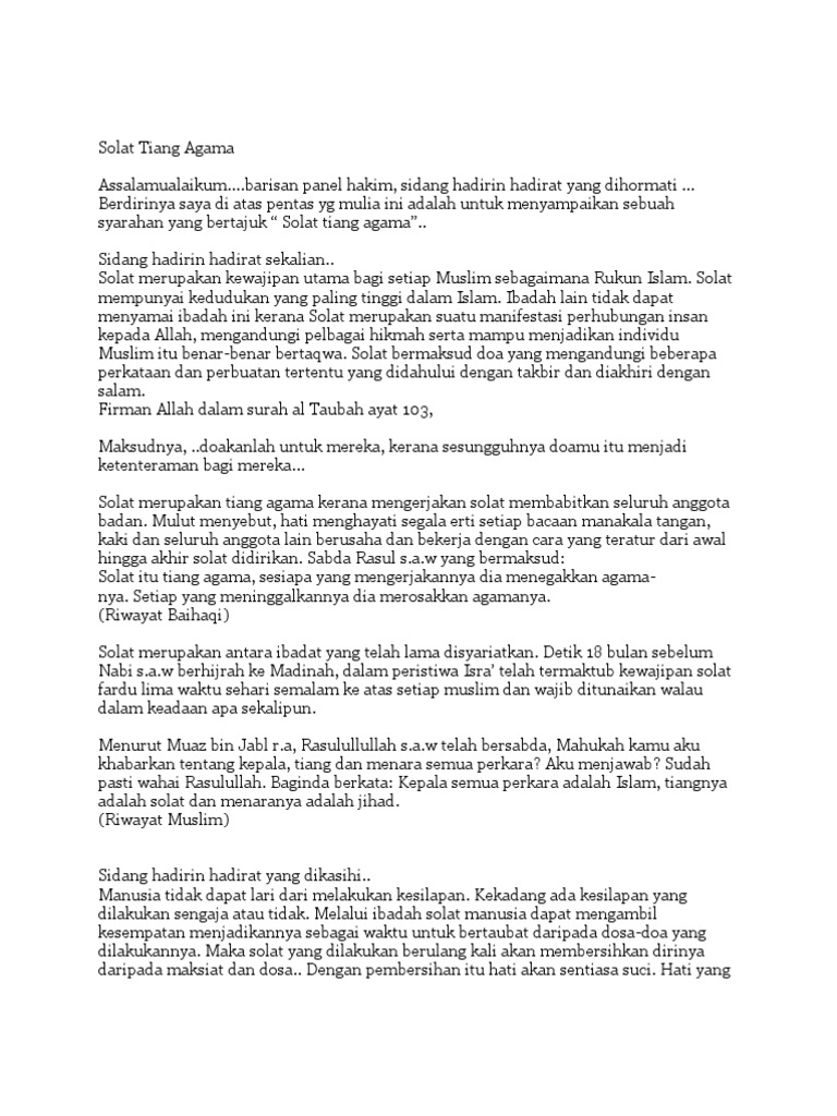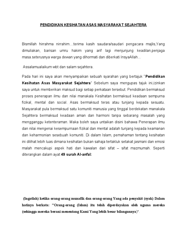 Lafaz Bismilah pembuka segalaPutera Sekolah Menengah Kebangsaan Taman Panglima memulakan bicaraSebelum bibir menitip kata membawa wacana Iman dan Taqwa Asas Jati Diri Muslim izinkan saya mengucapkan apresiasi saya untuk pemimpin dewan yang budimankombinasi panel hakim yang adil. Sebelum bahtera saya layarkan sebelum layar saya kibarkan sebelum kaki mengatur langkah sebelum lidah mengatur bicara biarlah saya mendefinasikan tajuk syarahan saya pada. Tl0ngg mail kat sya urgent nieyhh.