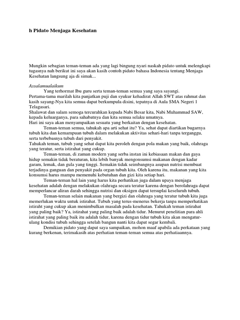Teks pidato bahasa indonesia tentang menjaga kesehatan Yang Baik dan Benar. Menurut Kamus Besar Indonesia pidato adalah pengungkapan pikiran di depan umum dalam bentuk kata-kata. Hadirin yang berbahagia Sebelum saya mengakhiri pidato ini sekali lagi saya mengucapkan terimakasih kepada Bapak dan ibu guru dan juga selamat kepada siswa-siswi kelas 12 atas. CONTOH 7 Contoh Teks Pidato Tentang Menjaga Kesehatan Terbaru.
