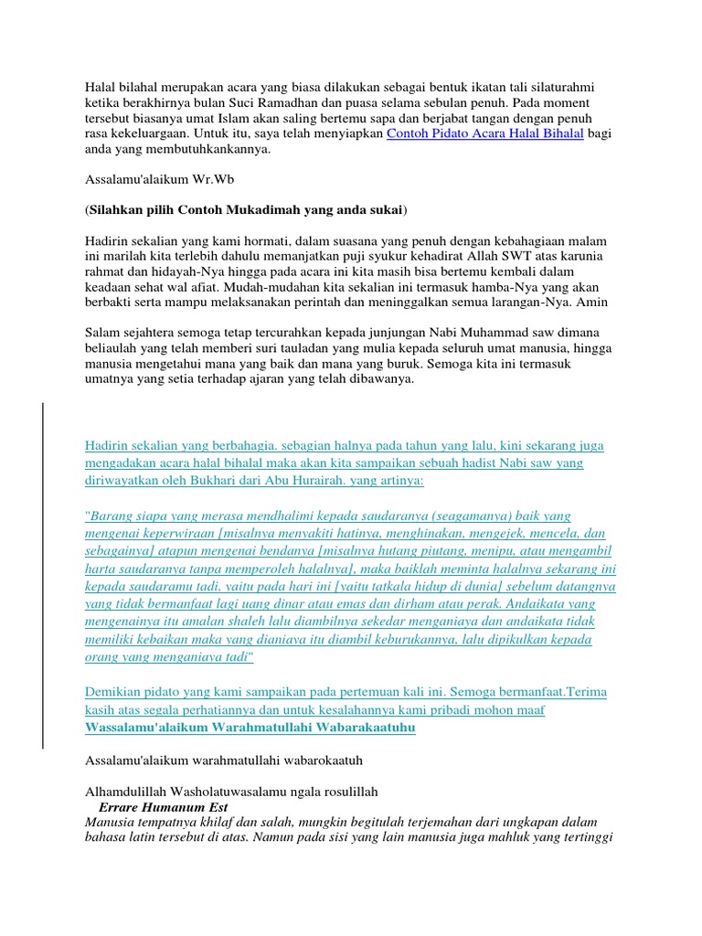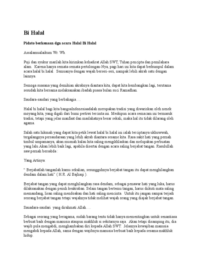 Contoh Sambutan Acara Halal Bihalal Singkat Contoh Naskah Sambutan Acara Halal Bihalal Singkat Berikut ini adalah Teks kumpulan Pidato sambutan keagaman atau ceramah keagaman bertemakan Halal BihalalNaskah Pidato dalam rangka Acara Halal Bihalal ini ditulis sebagai reverensi dan juga memudahkan semua orang apabila ingin. Pentas seni dari seniman SMPN. Pidato berkenaan dgn acara Halal Bi Halal Assalamualaikum Wr.