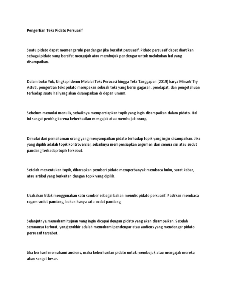 Teks Pidato Persuasif Adalah Sebagai Berikut Kecuali. Teks Pidato adalah sebuah kegiatan berbicara di depan umum atau berorasi untuk menyatakan pendapatnya Orang yang melakukan pidato disebut sebagai oratorPidato yang baik harus berisi kalimat eksposisi susunan yang benar serta bisa dipahami oleh pendengarnya. Pidato persuasif adalah jenis pidato yang bertujuan untuk menarik perhatian para pendengar memengaruhi serta bersifat mengajak atau membujuk para pendengar agar mereka menjadi yakin dan mau mengambil tindakan bahkan melakukan sesuai dengan tujuan pidato tersebut.