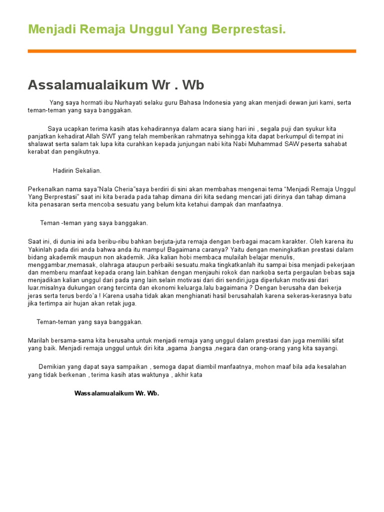 Remaja adalah masa dimana kita sebenarnya dihadapkan akan banyak tantangan dan masalah. Ucapan syukur pada Tuhan. Pidato persuasif adalah pidato yang mengajak maksudnya mengajak adalah mengajak halayak untuk mengikuti apa.