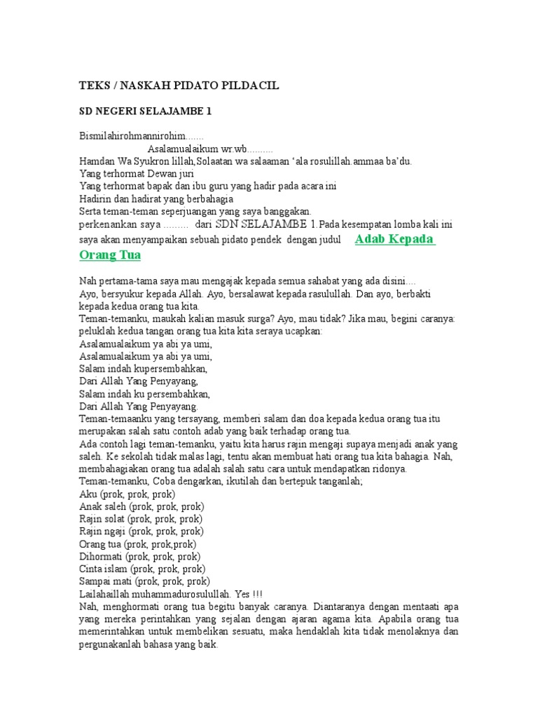 Bagi anda orang tua atau calon dai muda yang ingin mencarikan refeensi pidato Pildacil Anak Soleh bisa menjadikan teks dibawah ini sebagai referensi atau bahan bacaan. Syukran wa jazaakumullahu khairan. Teman-temaanku yang tersayang memberi salam dan doa kepada kedua orang tua itu merupakan salah satu contoh adab yang baik terhadap orang tua.