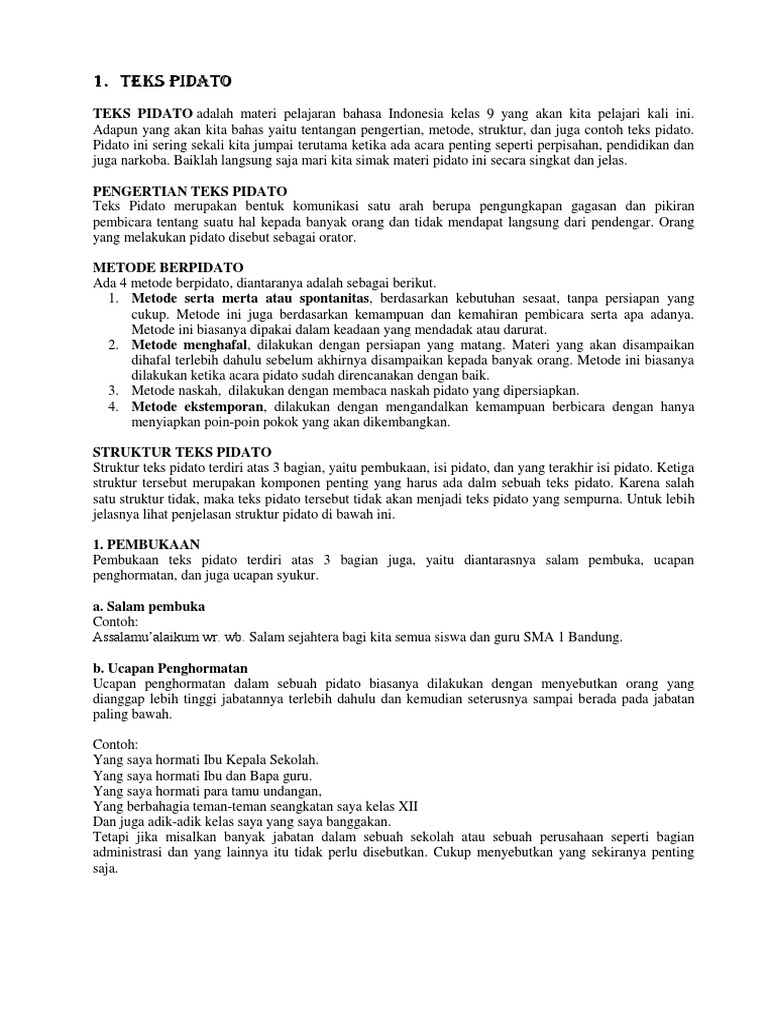 Jadi pidato adalah salah satu materi pelajaran bahasan indonesia ketika kita duduk di kelas 9 smp. Secara umum pidato adalah pengungkapan gagasan atau pikiran dengan bahasa lisan berbicara kepada orang banyak. Ekstemporan yaitu metode berpidato dengan terlebih dahulu menyiapkan konsep pidato secara garis besar dengan membuat catatan kecil.