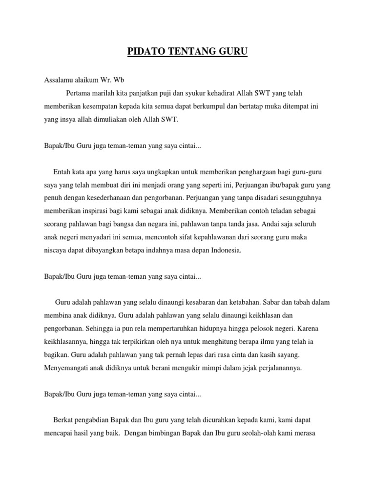 Contoh teks pidato hari guru Yang Baik dan Benar. Hal itu merupakan bentuk rasa terimakasih kita kepada para guru yang telah berjuang untuk mencerdaskan bangsa. Lihat Contoh Pidato Lain. Guru kita pun tahu benar siapa mereka.